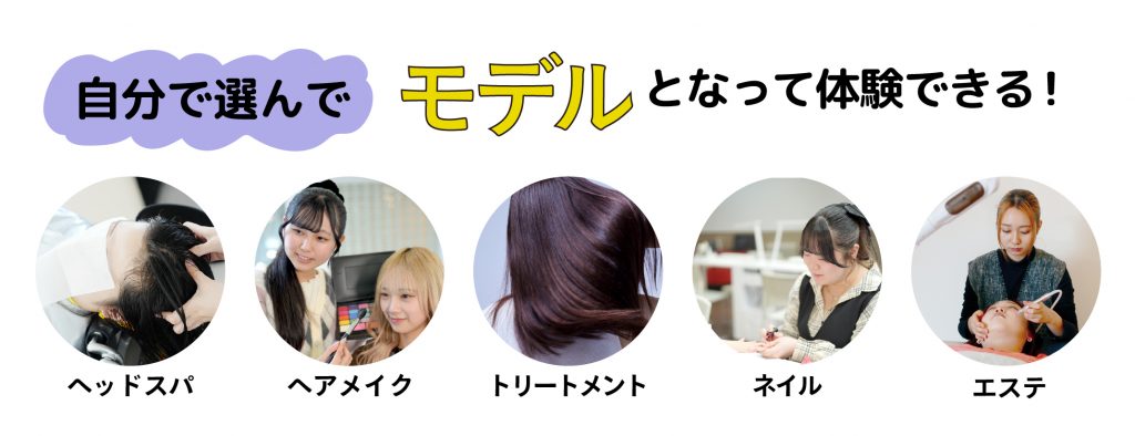 学校の雰囲気を知ることができるだけでなく、実際に授業で学ぶ美容テクニックを体験したり、あなた自身がモデルになって、ヘアメイクやエステ、ネイルの施術を体感できたりと、いろんな発見ができるはず。美容のことを全く知らなくても大丈夫。お気軽にご参加ください!