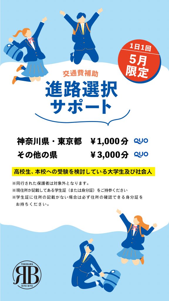 [5月限定]進路選択サポート!QUOカードプレゼント 2026/04/28 体験入学にお越しの皆様へ、5月限定で交通費補助としてQUOカードをプレゼントします!ぜひこの機会にお越しください!※お住まいの場所により、補助金がことなります。※高校生、または本校への受験を検討している大学生及び社会人※同行された保護者は対象外となります。※現住所が記載してある学生証(または身分証)をご持参ください