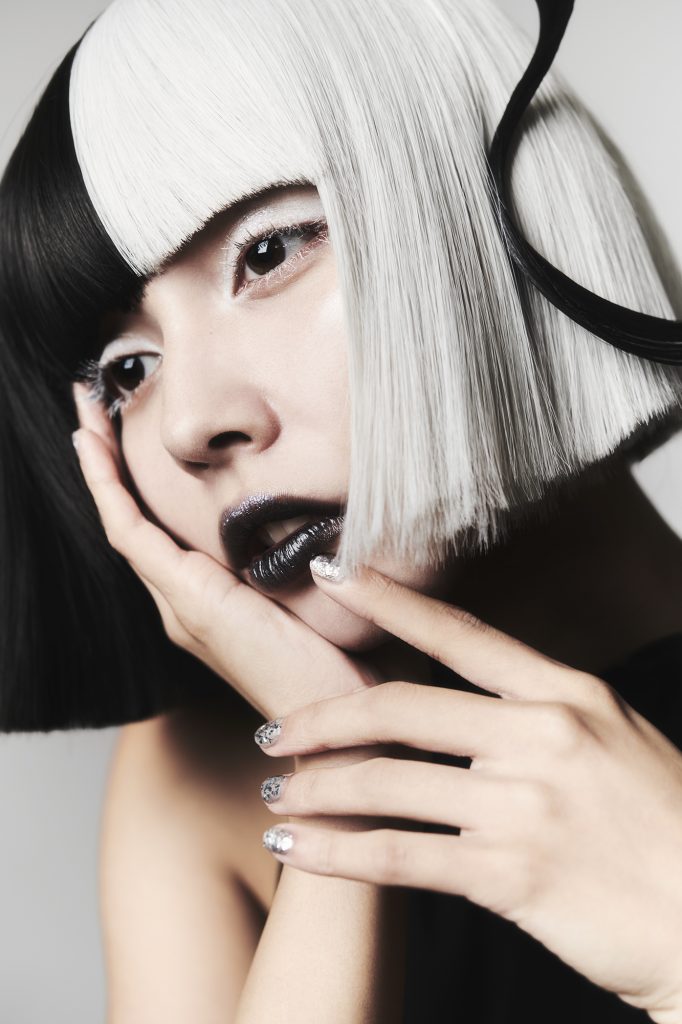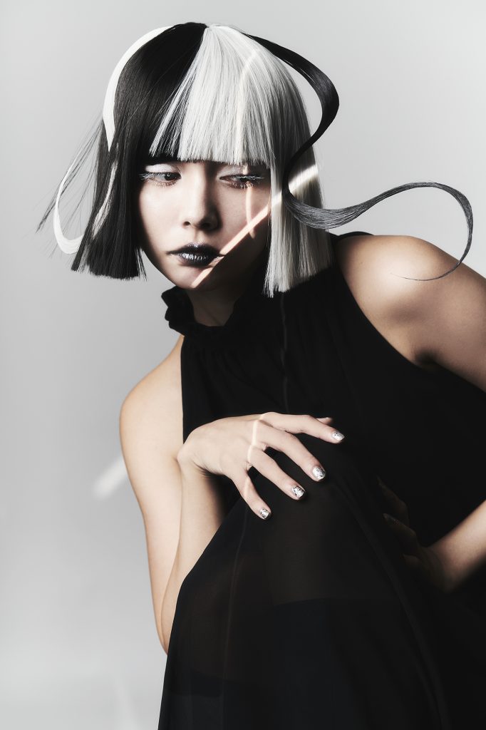 「光と影」というテーマを白と黒で表現するために、いろいろと工夫が必要でした。パウダーだと薄くなってしまう部分は、発色がよくなるように白いリップを使ったりしました。ウィッグは白と黒のものを半分に切って縫い合わせて作りました。でも、そのアイデアが出るまでが本当に大変で、この形にするまでに時間も練習もすごく掛かって。とうとう、切ると決断して実際にハサミを入れた時は、本当に緊張しましたが、計算通りに仕上げることができました。